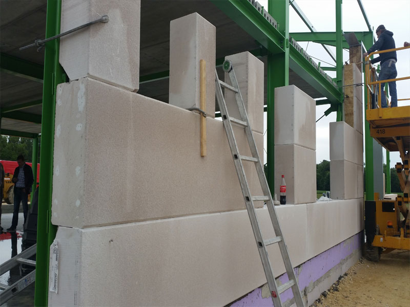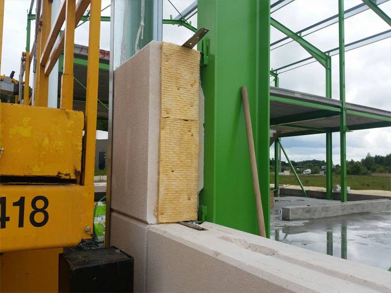 vor der Stahlkonstruktion verlegt. Einschließlich aller Schrägschnitte, Tor-, Konsol- und Riegelaussparungen sowie der Eck- und Fensterendstücke, Passplatten.