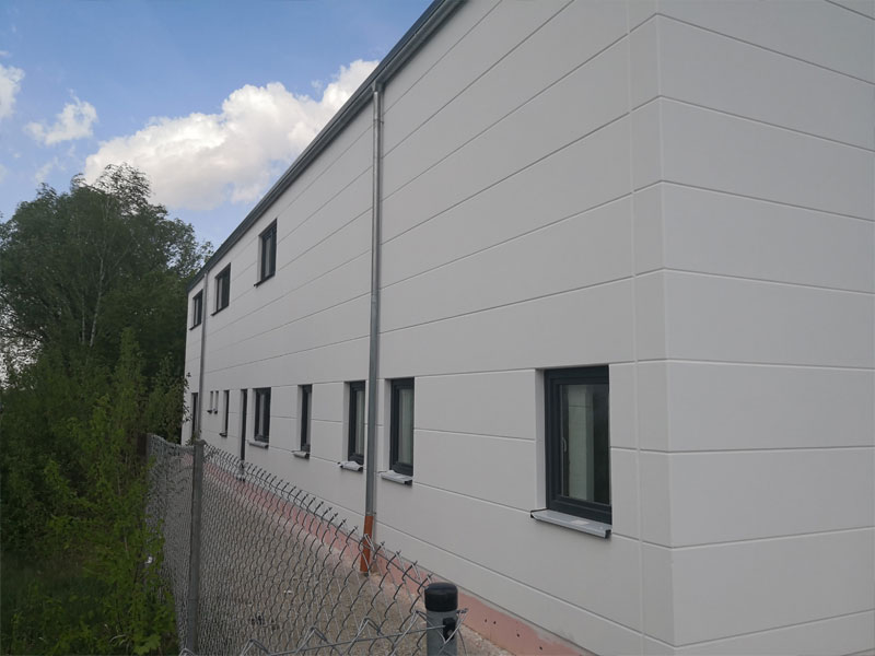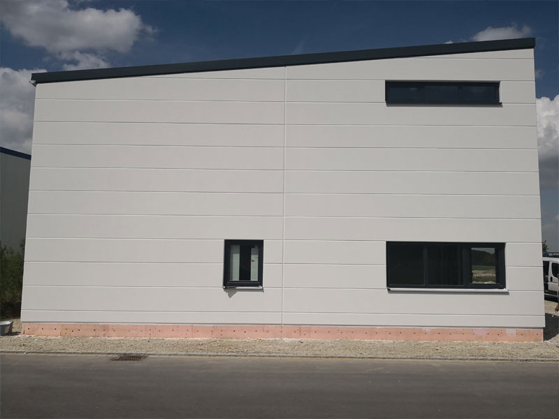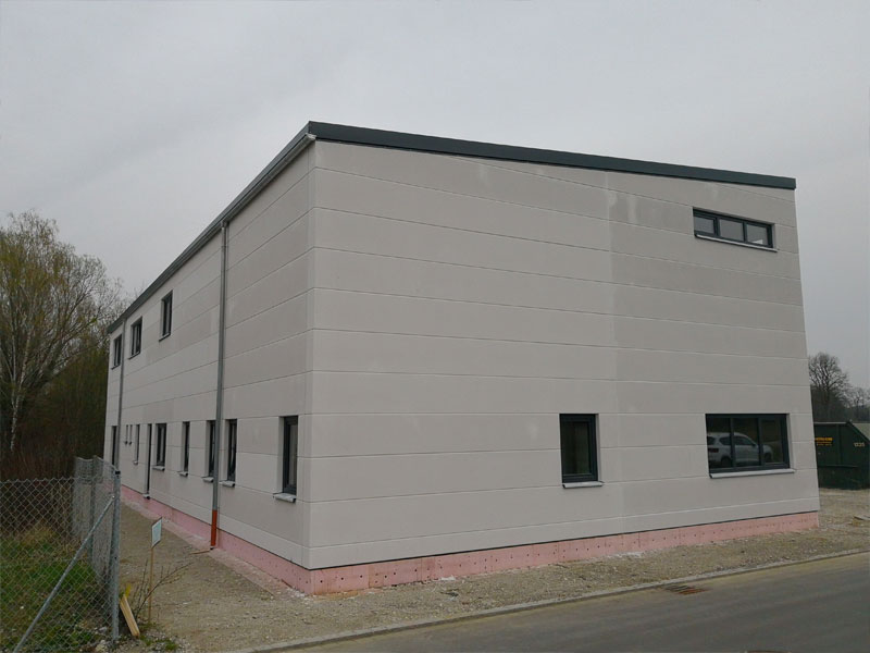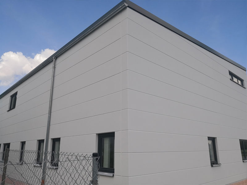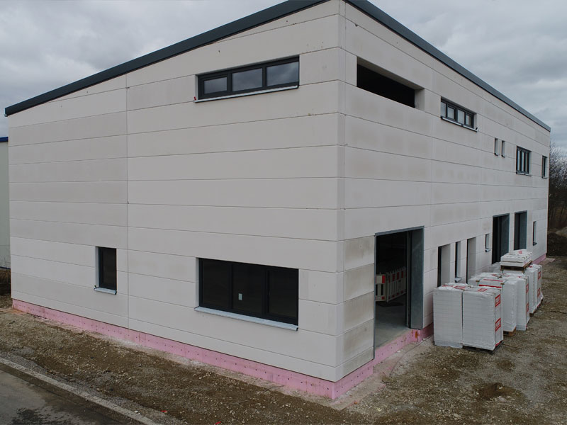 Werkhallenbau mit Außenwand aus liegend verlegten Porenbeton-Wandplatten mit gefasten Längskanten