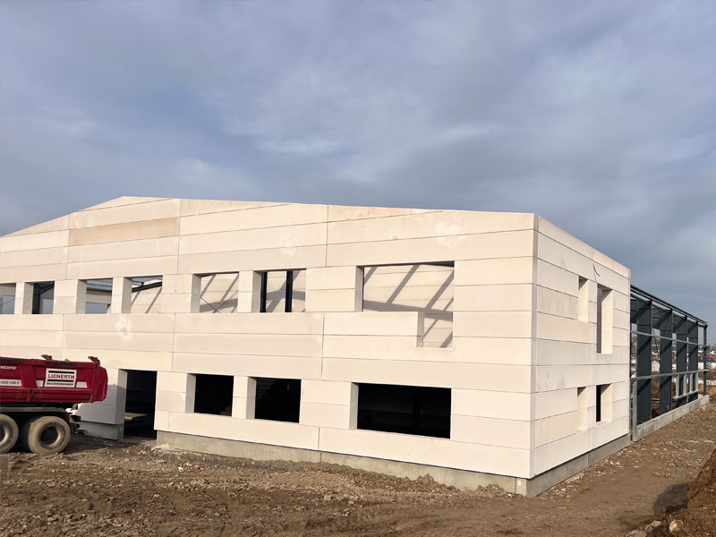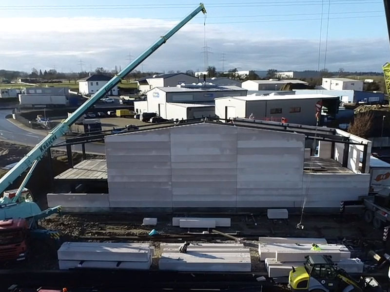 Hallenbau mit Außenwand aus liegend verlegten Porenbeton-Wandplatten mit gefasten Längskanten