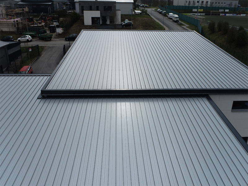Werkhallenbau-Thermodach, Kerndicke 120 mm, aus doppelschaligem, bandverzinktem und kunststoffbeschichtetem Profilstahlblechen im Standardfarbton nach Wahl des AG.