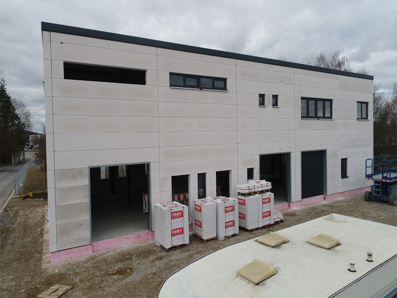 Werkhallenbau mit Außenwand aus liegend verlegten Porenbeton-Wandplatten mit gefasten Längskanten